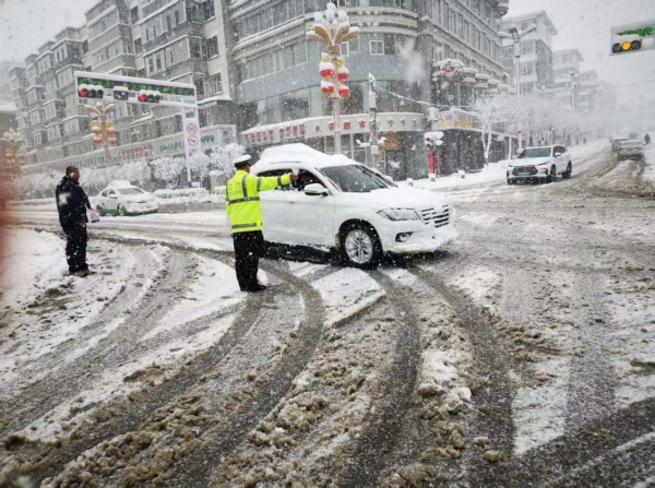 4月13日,白山市长白县迎来强降雪天气。为保障道路畅通,长白交警大队全体警员迅速启动应急预案,第一时间奔赴各个交通要道。
