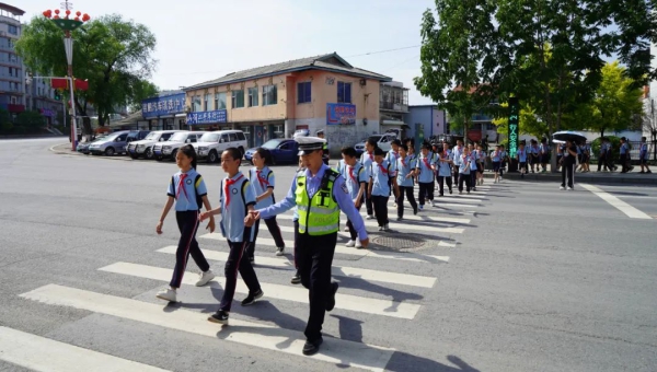 随后,民警带领学生来到校门外的路口,通过“小手拉大手”的方式架起平安桥,带领学生安全过马路,指导学生走人行横道有序过马路,观察信号灯及左右车辆,切实感受和掌握马路行走的基本交通规则。