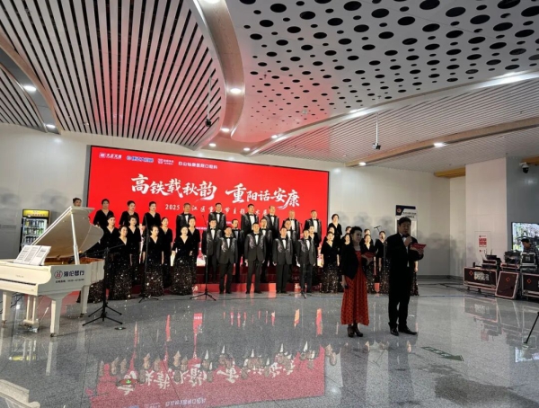本次展演吸引数百名观众现场围观。展演内容丰富多元,节目编排紧扣“重阳”与“高铁”两大核心元素,从激昂的大合唱到悠扬的小合唱,从深情的诗朗诵到灵动的歌伴舞,每个节目各有特色,为观众呈现了一场文化盛宴。整场展演既以艺术之美传递了重阳敬老的温情,也借灵动演绎展现了高铁时代的活力,让现场观众在沉浸式观赏中感受到传统节日与时代发展的交融之韵。