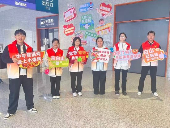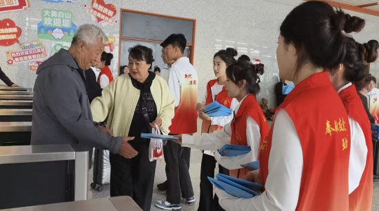 崭新的白山东站内,熙攘的旅客与志愿者们身上那一抹抹鲜艳的“志愿红”交相辉映。这些经过系统培训的志愿者手持精心设计、富有地方特色的欢迎牌——“来白山 参情款待”“白山欢迎您”“哎呀妈呀 你咋才来”……一句句接地气的问候,一张张温暖的笑脸,瞬间拉近了与旅客的距离,营造出浓浓的“回家”氛围。