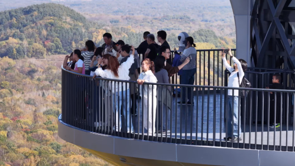 四海龙湾玛珥湖的秋日风光同样吸引着众多游客。澄澈的湖水倒映着湛蓝的天空与斑斓的山林,游客沿着栈道漫步,近距离欣赏“森林之眼”的独特魅力。10月2日,景区内还上演了一场自发的爱国合唱,游客们挥舞着五星红旗,齐声高唱《五星红旗迎风飘扬》,激昂的歌声在湖畔回荡,成为黄金周期间最动人的瞬间。据统计,“十一”前夕刚刚落成的四海龙湾玛珥湖景区,在“十一”假期前3日接待人次达5000余人,收入达83.3万元。“这还是在试运营期,按照这个趋势,随着各项设施和业态的不断完善,我们会发展得更好。”靖宇县文旅集团总经理李赫充满期待地说。